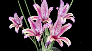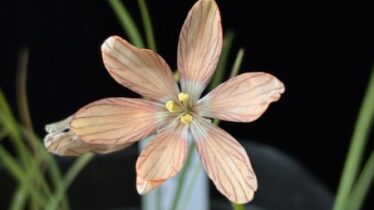 筋模様が入った花を咲かせるイキシアです。花は2cm、高さ8c...