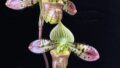 まるで血管のような少しグロテスクな模様のリップに、色彩豊かで斑点のある個性的なペタル、緑のストライプが入った爽やかなドーサルと見れば見るほど不思議な花です。